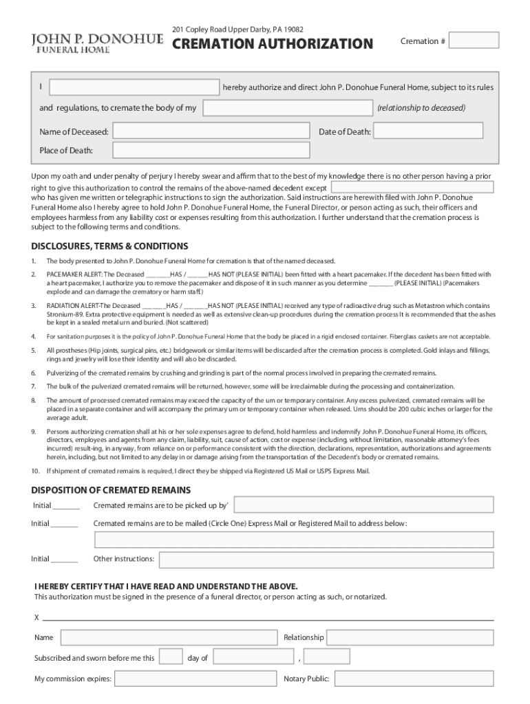 201 Copley Road Upper Darby, PA 19082CREMATION AUTHORIZATION Cremation #hereby authorize and direct John P. Donahue Funeral Home, subject to its rules(relationship to deceased)and regulations, to