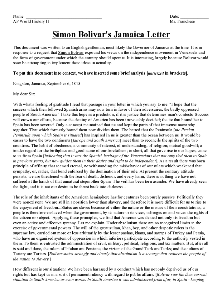 Name: ___ AP World History IDATE: ___ Mr. FrancheseSimon Bolivar\'s Jamaica Letter This document was written to an English gentleman, most likely the Governor of Jamaica at the time. It is in response