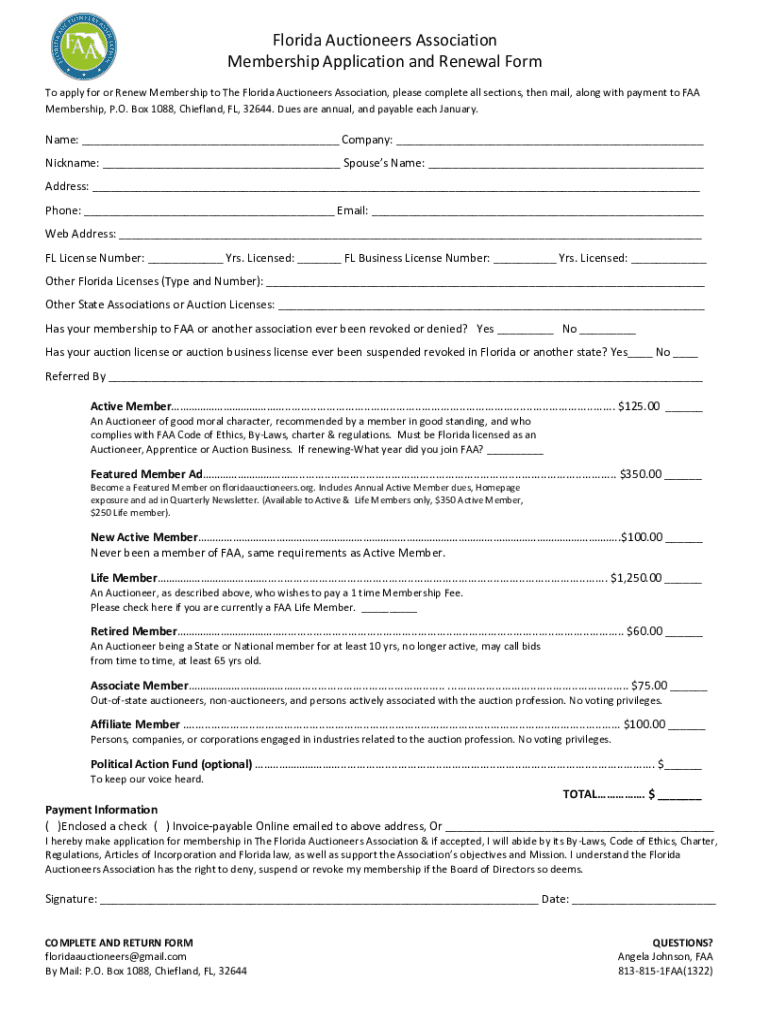 Florida Auctioneers Association Membership Application and Renewal Form To apply for or Renew Membership to The Florida Auctioneers Association, please complete all sections, then mail, along with