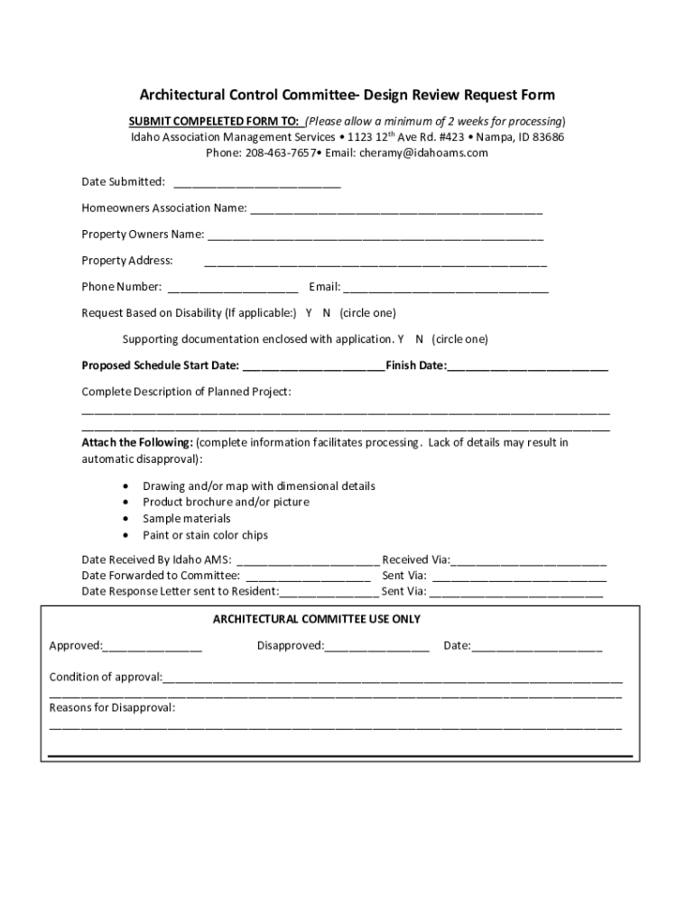 Architectural Control Committee Design Review Request Form SUBMIT COMPLETED FORM TO: (Please allow a minimum of 2 weeks for processing) Idaho Association Management Services 1123 12th Ave Rd. #423