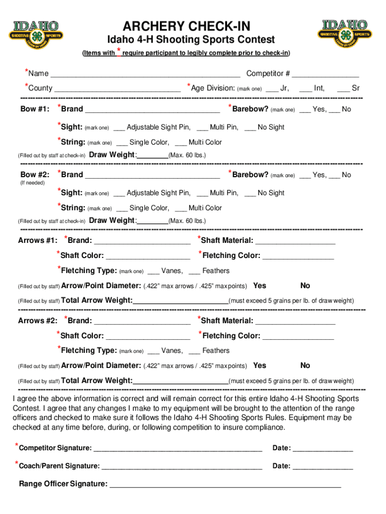 ARCHERY CHECKING Idaho 4H Shooting Sports Contest (Items with * require participant to legibly complete prior to checking) *Name ___ Competitor # ___ *County ___ *Age Division: (mark one) ___ Jr,
