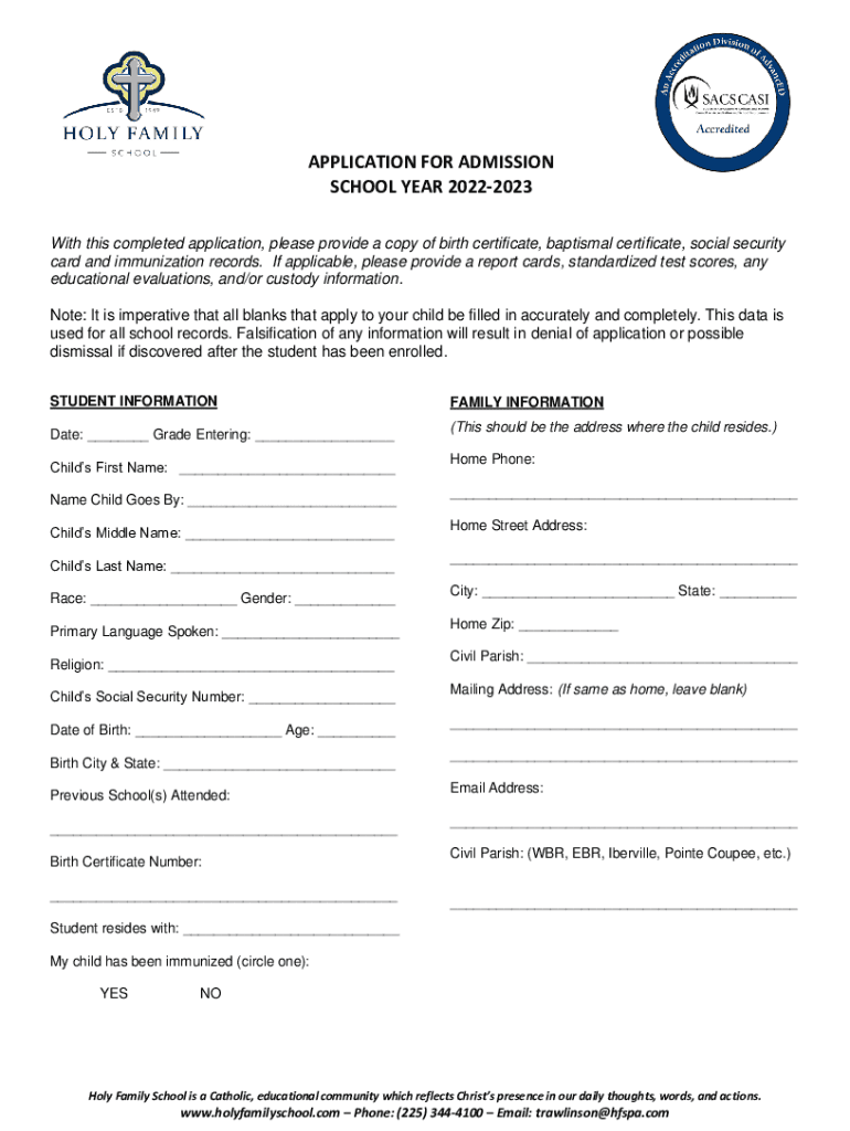 APPLICATION FOR ADMISSION SCHOOL YEAR 20222023 With this completed application, please provide a copy of birth certificate, baptismal certificate, social security card and immunization records. If