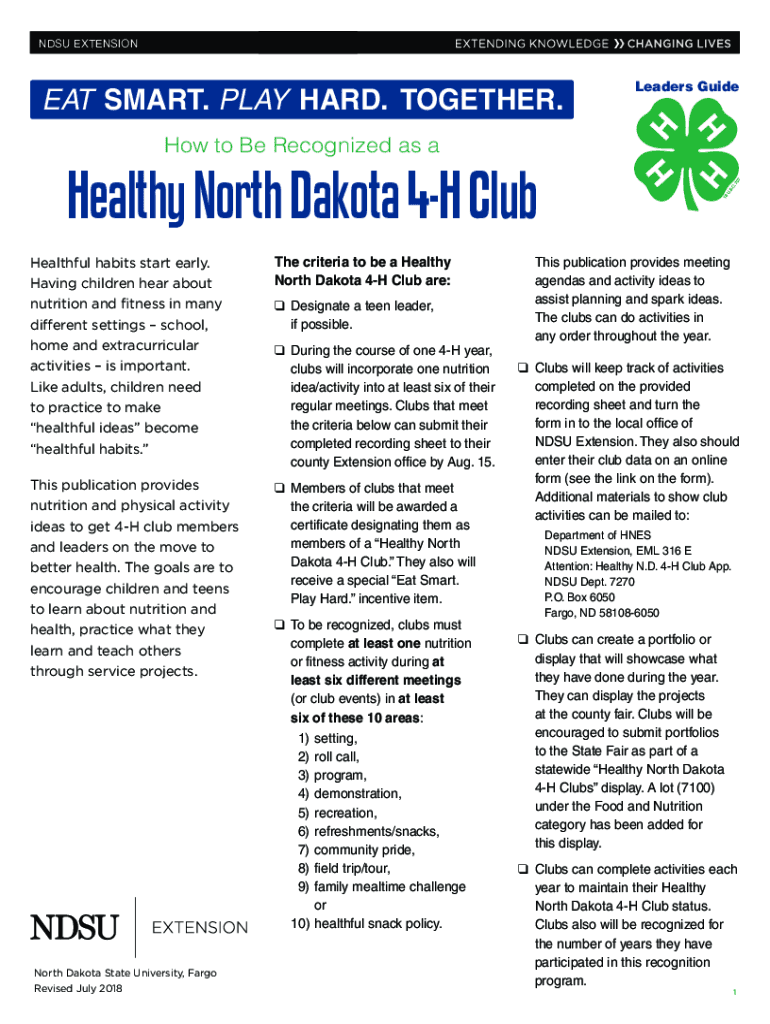 DSU EXTENSION EAT SMART. PLAY HARD. TOGETHER. Leaders Guide to Be Recognized as healthy North Dakota 4H Club Healthful habits start early. Having children hear about nutrition and fitness in many