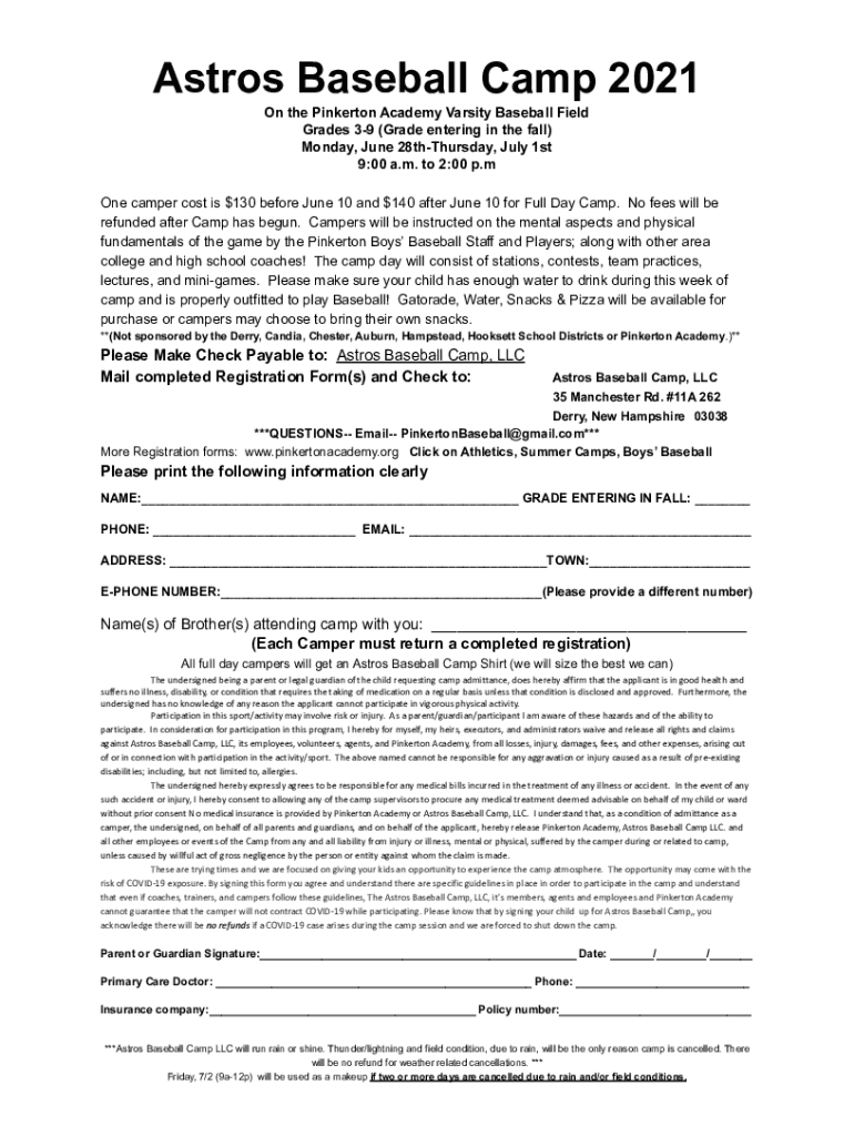 Actors Baseball Camp 2021 On the Pinkerton Academy Varsity Baseball Field Grades 39 (Grade entering the fall) Monday, June 28thThursday, July 1st 9:00 a.m. to 2:00 p.m One camper cost is $130 before