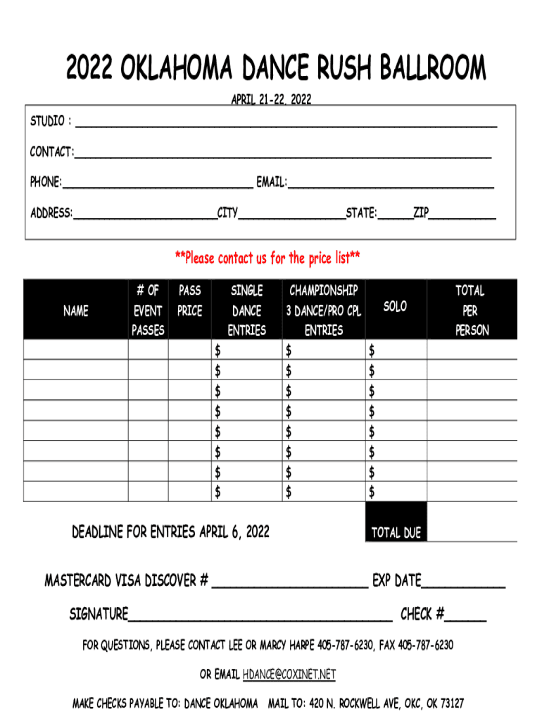 2022 OKLAHOMA DANCE RUSH BALLROOM APRIL 2122, 2022 STUDIO : ___ CONTACT:___ PHONE:___ EMAIL:___ ADDRESS:___CITY___STATE:___ZIP___**Please contact us for the price list** NAME# OF EVENT PASSESPASS