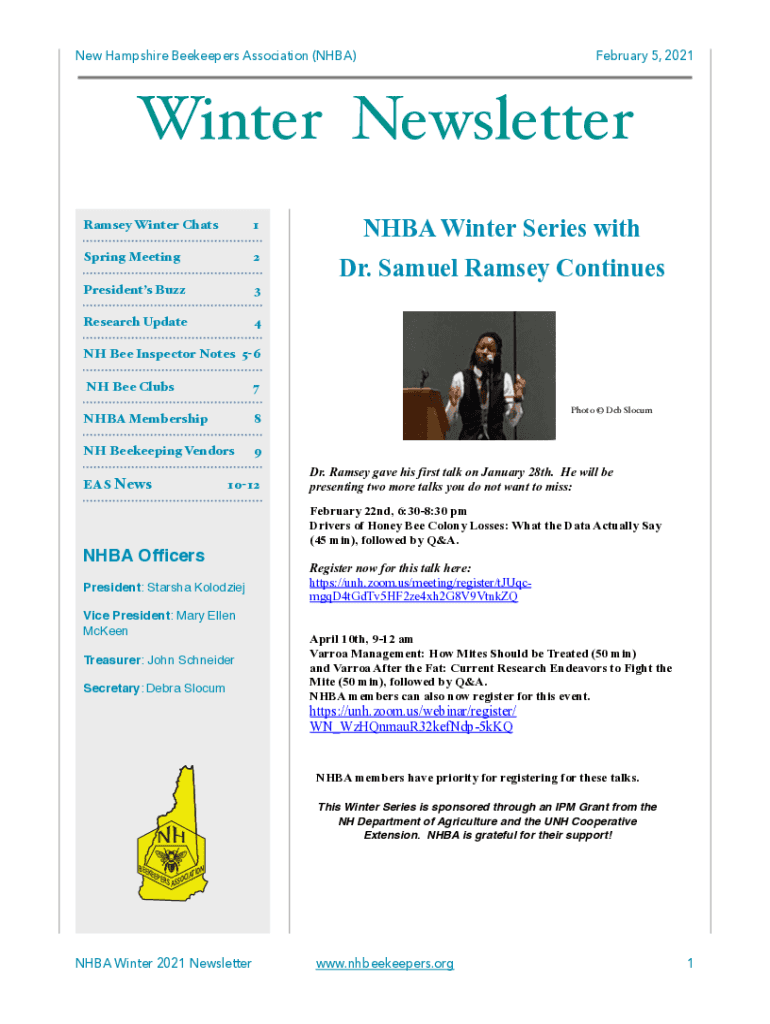 New Hampshire Beekeepers Association (NBA)February 5, 2021Winter Newsletter Ramsey Winter Chats1NHBA Winter Series withering Meeting2Dr. Samuel Ramsey ContinuesPresidents Buzz3Research Update4NH Bee
