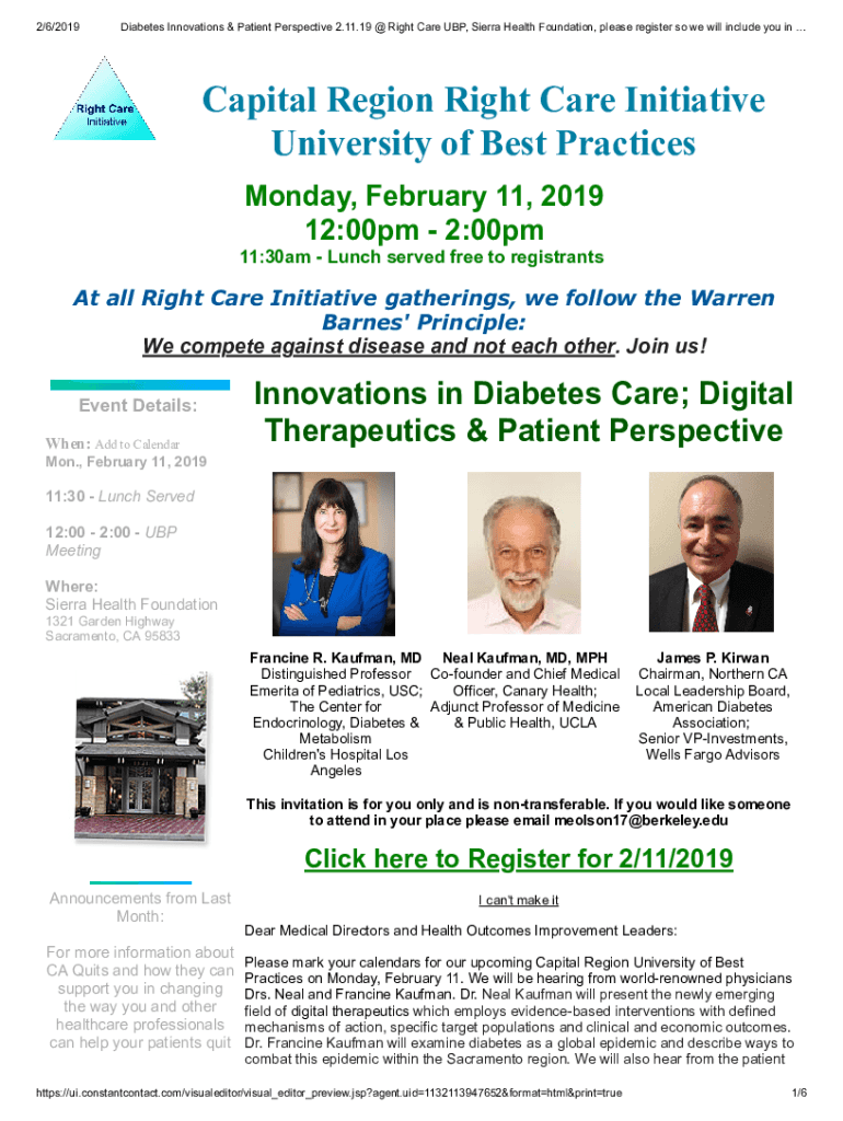 2/6/2019Diabetes Innovations & Patient Perspective 2.11.19 @ Right Care UP, Sierra Health Foundation, please register, so we will include you in Capital Region Right Care Initiative University of