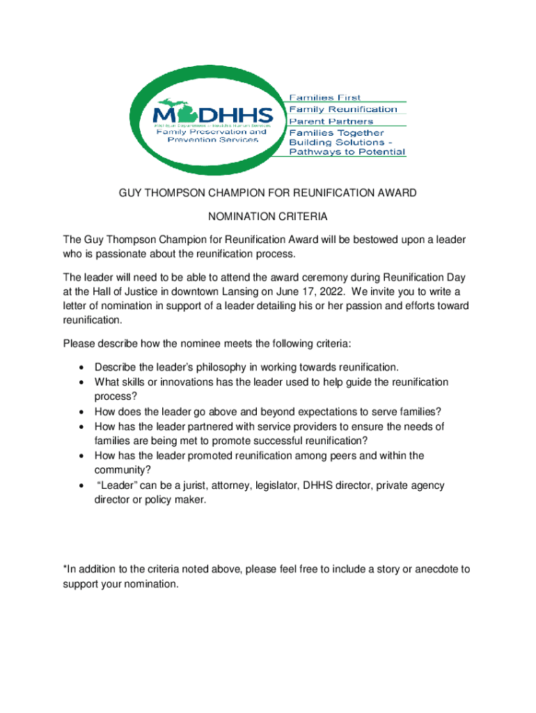 GUY THOMPSON CHAMPION FOR REUNIFICATION AWARD NOMINATION CRITERIA The Guy Thompson Champion for Reunification Award will be bestowed upon a leader who is passionate about the reunification process.