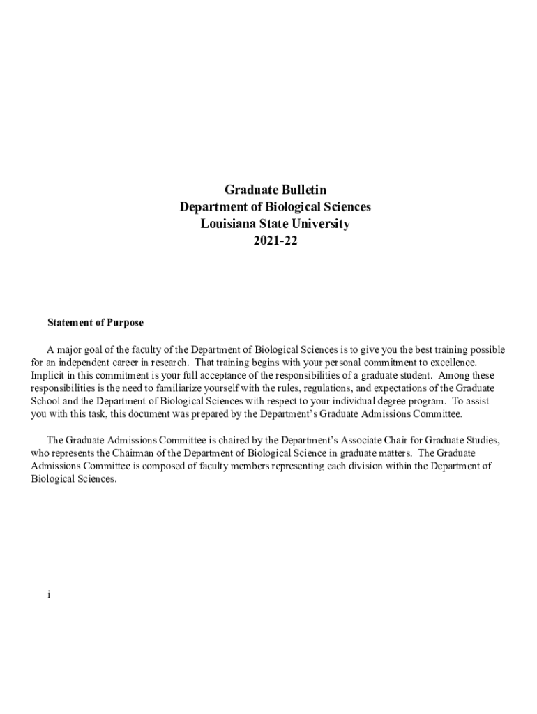 Graduate Bulletin Department of Biological Sciences Louisiana State University 202122Statement of Purpose A major goal of the faculty of the Department of Biological Sciences is to give you the best