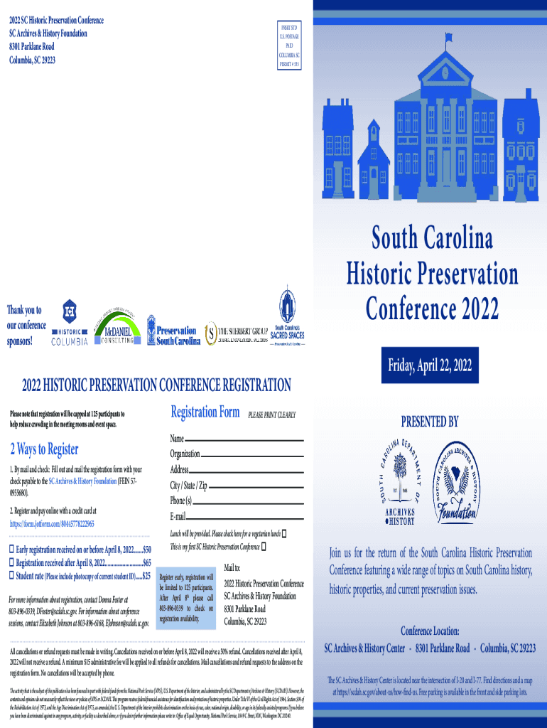 SCDAHSCGovStatewide-Historic-Preservation-Conference is an annual conference organized by the South Carolina Department of Archives and History to discuss and promote historic preservation.