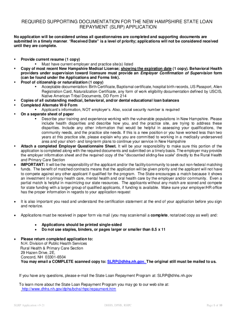 REQUIRED SUPPORTING DOCUMENTATION FOR THE NEW HAMPSHIRE STATE LOAN REPAYMENT (SLIP) APPLICATION No application will be considered unless all questionnaires are completed and supporting documents are