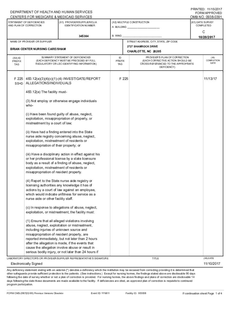 PRINTED: 11/15/2017 FORM APPROVEDDEPARTMENT OF HEALTH AND HUMAN SERVICES CENTERS FOR MEDICARE & MEDICAID SERVICES STATEMENT OF DEFICIENCIES AND PLAN OF CORRECTION(X1) PROVIDER/SUPPLIER/CIA IDENTIFICATION