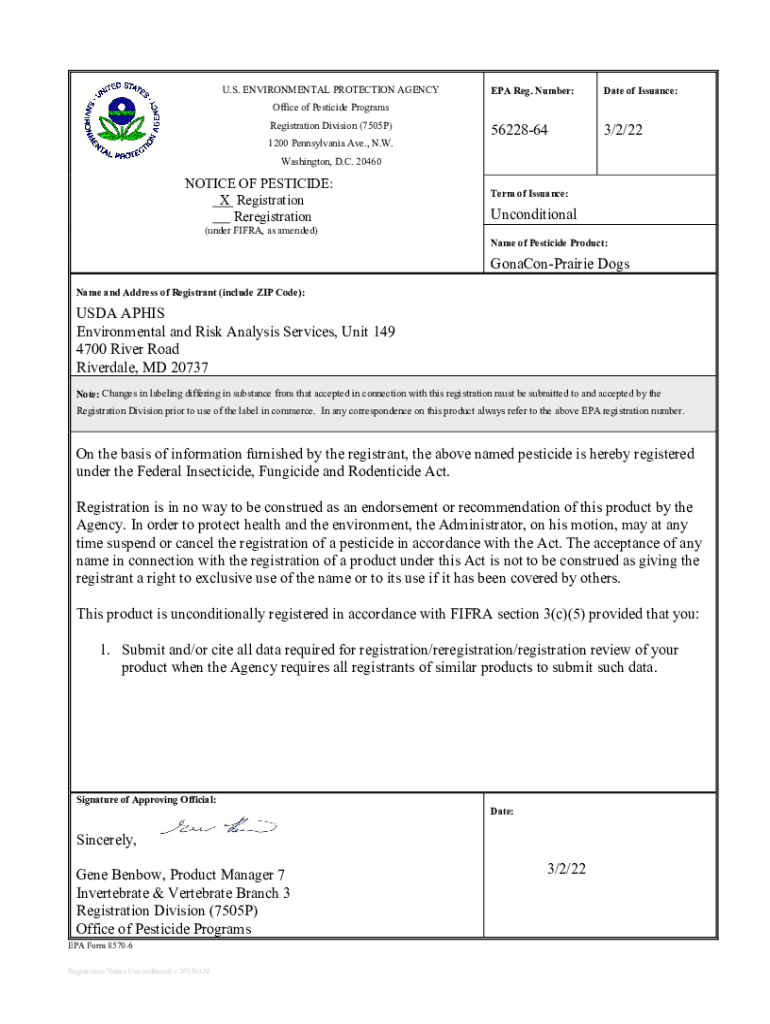 U.S. ENVIRONMENTAL PROTECTION AGENCY EPA Reg. Number:Date of Issuance:56228643/2/22Office of Pesticide Programs Registration Division (7505P) 1200 Pennsylvania Ave., N.W. Washington, D.C. 20460NOTICE