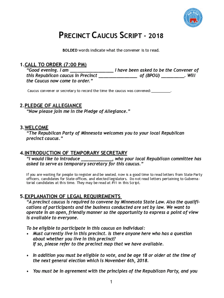 !PRECINCT CAUCUS SCRIPT 2018 ! BOLDED words indicate what the convener is to read. !!1.CALL TO ORDER (7:00 PM)Good evening. I am ___ I have been asked to be the Convener of this Republican caucus