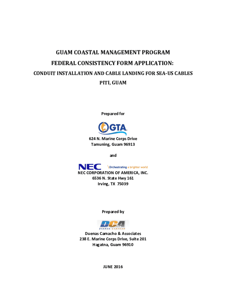 GUAM COASTAL MANAGEMENT PROGRAM FEDERAL CONSISTENCY FORM APPLICATION: CONDUIT INSTALLATION AND CABLE LANDING FOR SEATS CABLES PIT, Unprepared for624 N. Marine Corps Drive Tuning, Guam 96913 and NEC
