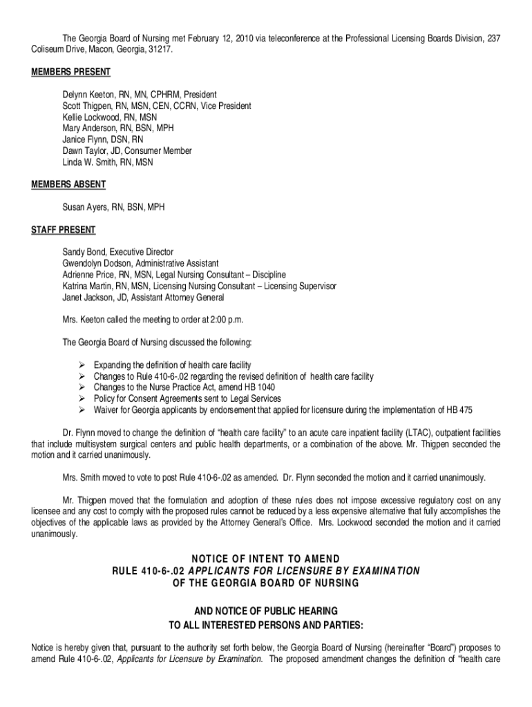 The Georgia Board of Nursing met February 12, 2010, via teleconference at the Professional Licensing Boards Division, 237 Coliseum Drive, Macon, Georgia, 31217. MEMBERS PRESENT Lynn Keaton, RN, MN,
