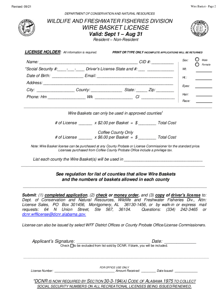 Wire Basket Page 1WIRE BASKET Valid: Sept 1 Aug 31 Resident Nonresident Alabama Game, Fish and Wildlife Law; Article 6; beginning with 911190 and Regulation 2202.46(3,) 2212.70, and 222.04L, see attached.