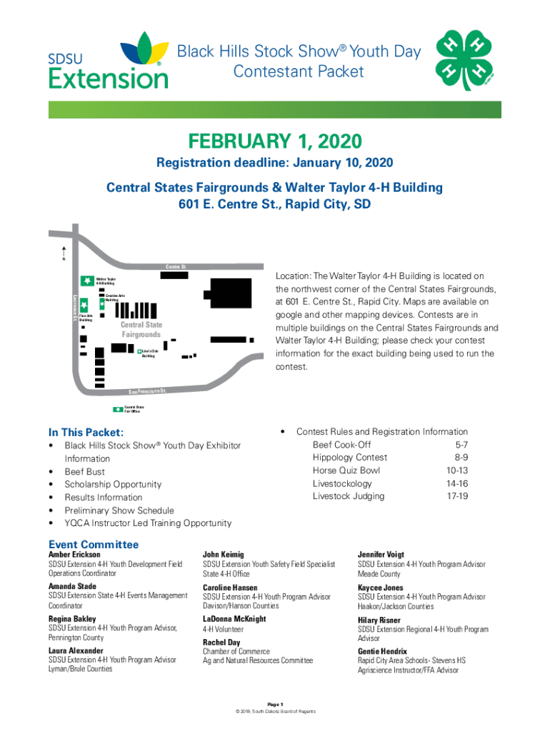 Black Hills Stock Show Youth Day Contestant PacketFEBRUARY 1, 2020 Registration deadline: January 10, 2020, Central States Fairgrounds & Walter Taylor 4H Building 601 E. Center St., Rapid City, Sincere