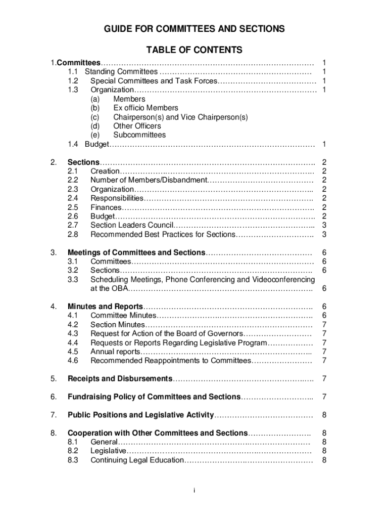 GUIDE FOR COMMITTEES AND SECTIONS TABLE OF CONTENTS 1. Committees 1.1 Standing Committees 1.2 Special Committees and Task Forces 1.3 Organization (a) Members (b) Ex officio Members (c) Chairperson(s)