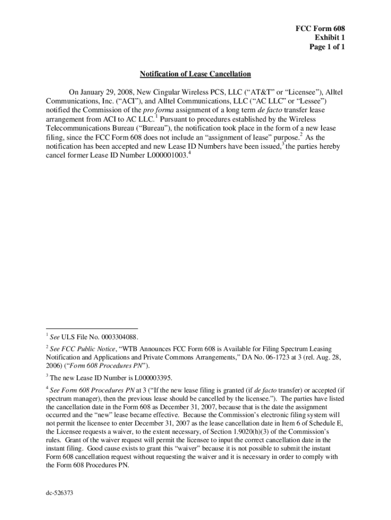 FCC Form 608 Exhibit 1-Page 1 of 1Notification of Lease Cancellation On January 29, 2008, New Singular Wireless PCS, LLC (AT&T or Licensee), All tel Communications, Inc. (ACI), and All tel Communications,