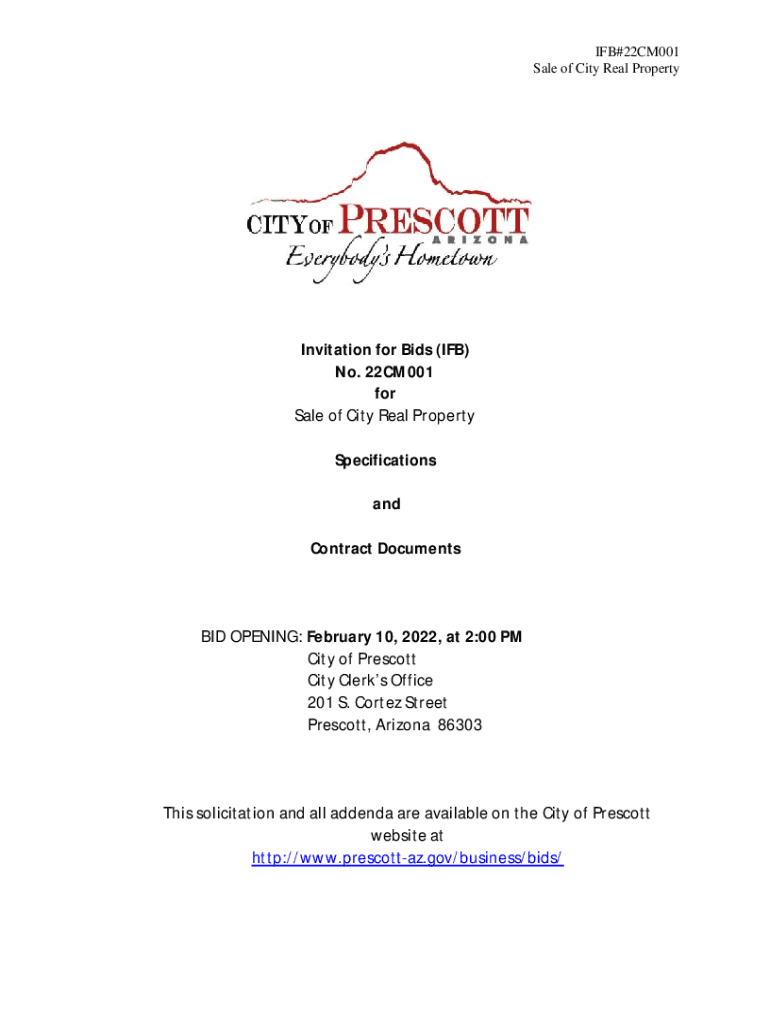 IF#22CM001 Sale of City Real PropertyInvitation for Bids (IF) No. 22CM001 for Sale of City Real Property Specifications and Contract Documents BID OPENING: February 10, 2022, at 2:00 PM City of Prescott