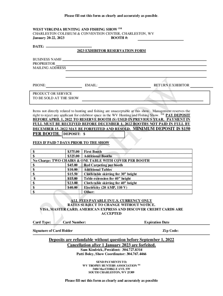 Please fill out this form as clearly and accurately as possible. WEST VIRGINIA HUNTING AND FISHING SHOW SM CHARLESTON COLISEUM & CONVENTION CENTER, CHARLESTON, WV January 2022, 2023 BOOTH #: DATE: