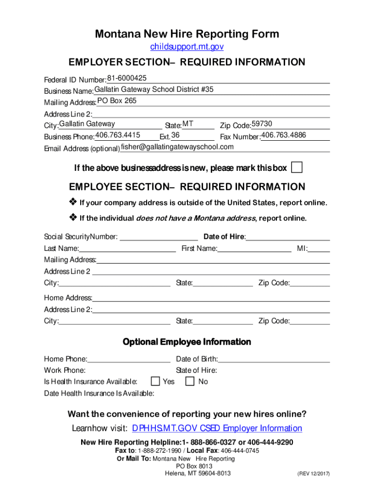 Montana New Hire Reporting Form child support.CT.employer SECTION REQUIRED INFORMATION Federal ID Number: 816000425 Business Name: Gallatin Gateway School District #35 Mailing Address: PO Box 265
