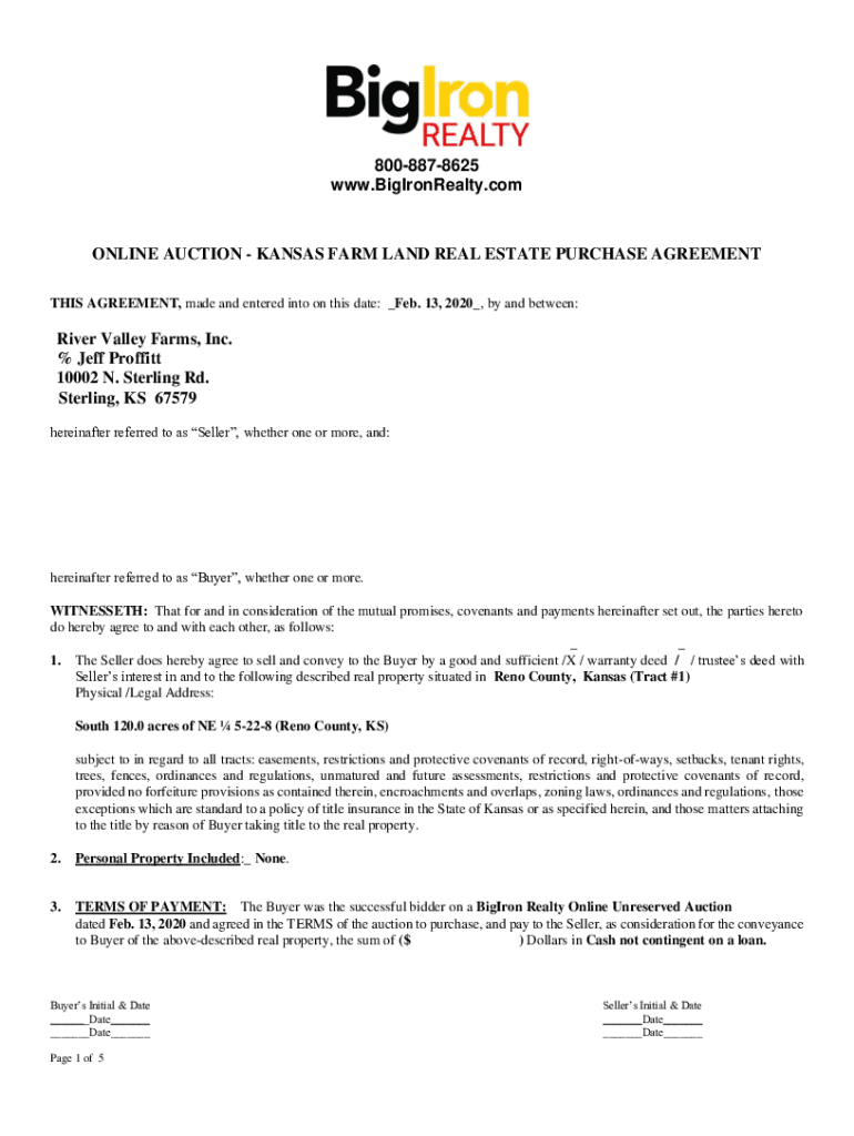 8008878625 www.BigIronRealty.comONLINE AUCTION KANSAS FARM LAND REAL ESTATE PURCHASE AGREEMENT THIS AGREEMENT, made and entered into on this date: _Feb. 13, 2020_, by and between:River Valley Farms,