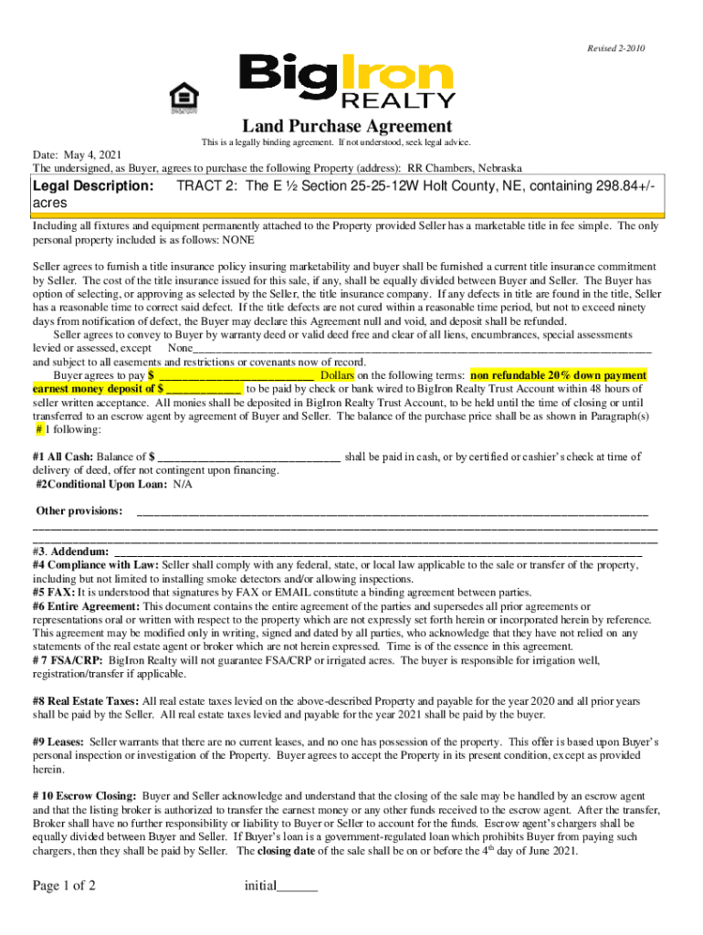Revised 22010Land Purchase Agreement This is a legally binding agreement. If not understood, seek legal advice. Date: May 4, 2021, The undersigned, as Buyer, agrees to purchase the following Property