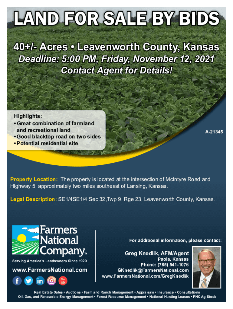 LAND FOR SALE BY BIDS 40+/ Acres Leavenworth County, Kansas Deadline: 5:00 PM, Friday, November 12, 2021, Contact Agent for Details! Highlights: Great combination of farmland and recreational land