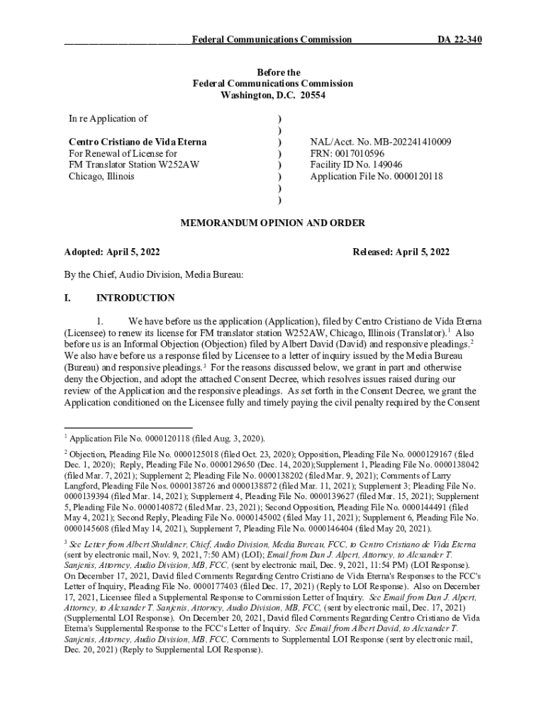 Get the free Communications Commission DA 22-340 Before the Federal ...