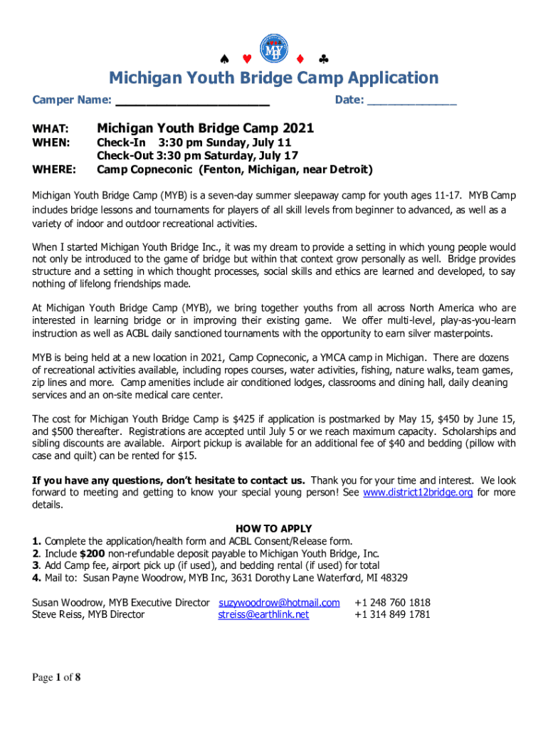 Michigan Youth Bridge Camp Application Camper Name: ___ Date: ___ WHAT: WHEN: WHERE:Michigan Youth Bridge Camp 2021CheckIn 3:30 pm Sunday, July 11 Checkout 3:30 pm Saturday, July 17 Camp Copneconic