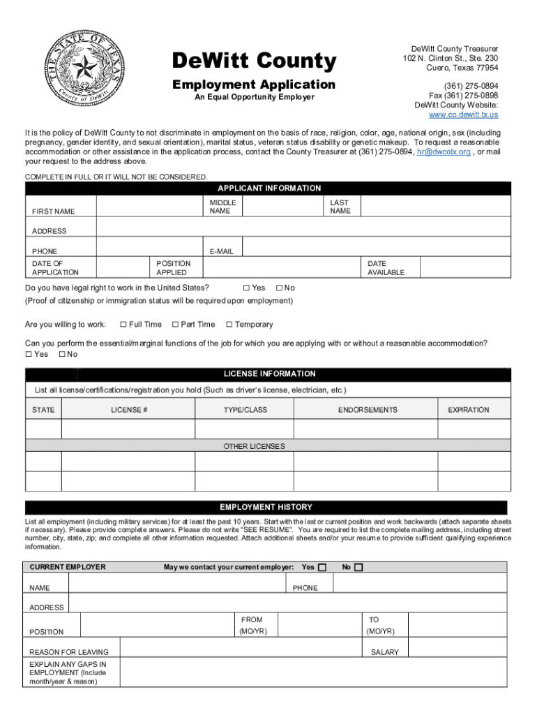 DeWitt CountyDeWitt County Treasurer 102 N. Clinton St., Ste. 230 Hero, Texas 77954Employment Application(361) 2750894 Fax (361) 2750898 DeWitt County Website: www.co.dewitt.tx.usAn Equal Opportunity