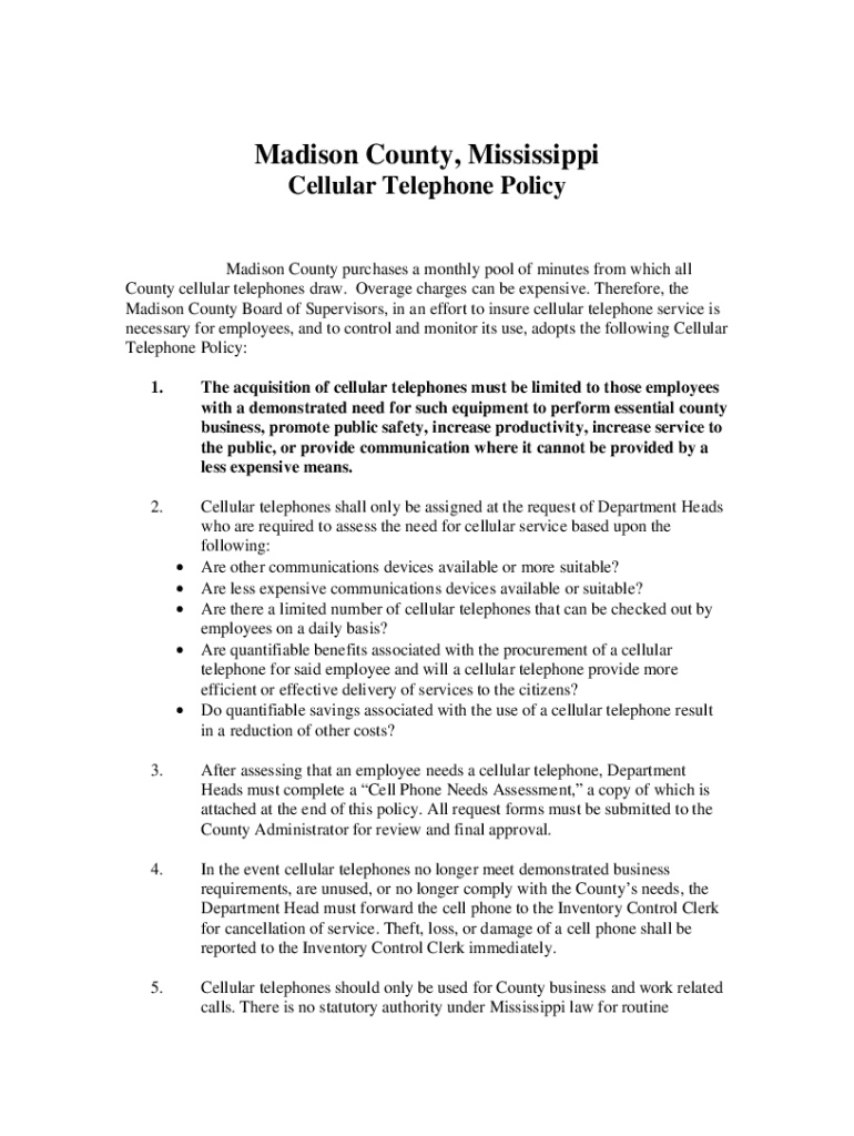 Madison County, Mississippi Cellular Telephone Policy Madison County purchases a monthly pool of minutes from which all County cellular telephones draw. Overage charges can be expensive. Therefore,