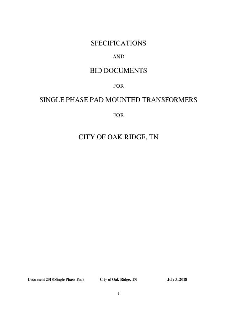 SPECIFICATIONS AND BID DOCUMENTS SINGLE PHASE PAD MOUNTED TRANSFORMERS FORCING OF OAK RIDGE, Document 2018 Single Phase Paucity of Oak Ridge, TN1July 3, 2018TABLE OF CONTENTS SECTION #TITLE of SECTION1.0INVITATION