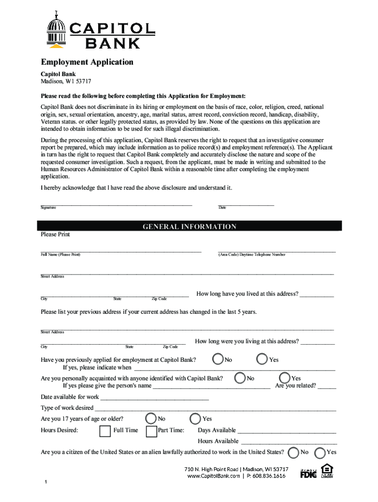 Employment Application Capitol Bank Madison, W1 53717 Please read the following before completing this Application for Employment: Capitol Bank does not discriminate in its hiring or employment on