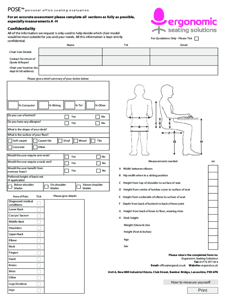 POSE p e r s o n an office seating evaluation an accurate assessment please complete all sections as fully as possible, especially measurements A Confidentiality All the information we request is