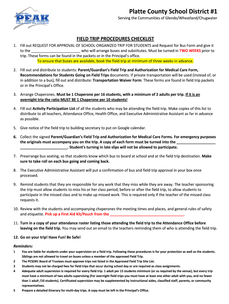 Get the free FIELD TRIP PROCEDURES CHECKLIST - platte1