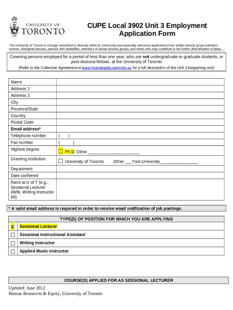 What is UTM Department of Management Application - CUPE Local 3902 Form?