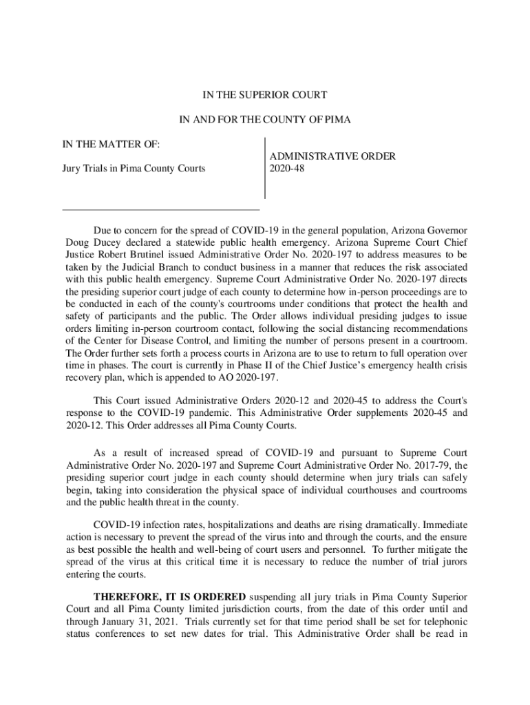 IN THE SUPERIOR COURT IN AND FOR THE COUNTY OF LIMA IN THE MATTER OF: Jury Trials in Pima County CourtsADMINISTRATIVE ORDER 202048___ Due to concern for the spread of COVID-19 in the general population,