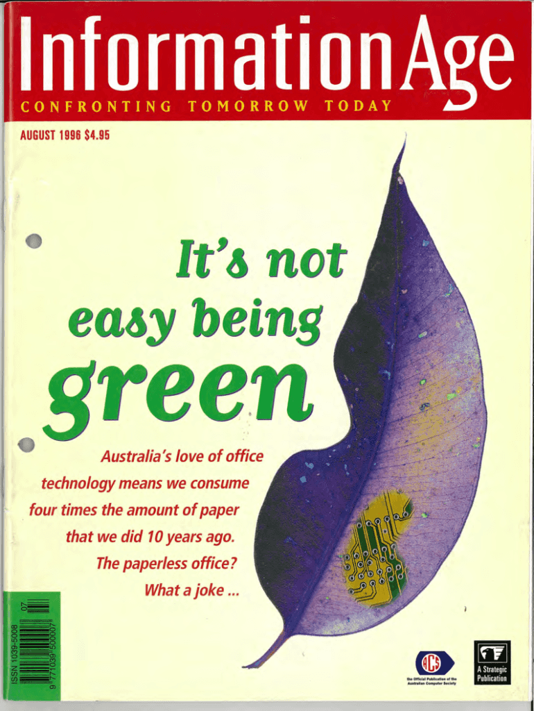 Informational CONFRONTINGTOMORROWTODAYAUGUST $19964.95It\'s not easy being green Australia\'s love of office technology means we consume :.four times the amount of paper that we did 10 years ago.