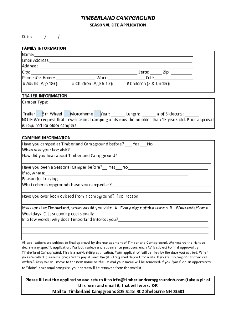 TIMBERLAND CAMPGROUND SEASONAL SITE APPLICATION Date: ___/___/___ FAMILY INFORMATION Name:___ Email Address:___ Address: ___ City: ___ State: ___ Zip: ___ Phone #s: Home: ___ Work:___ Cell:___ # Adults