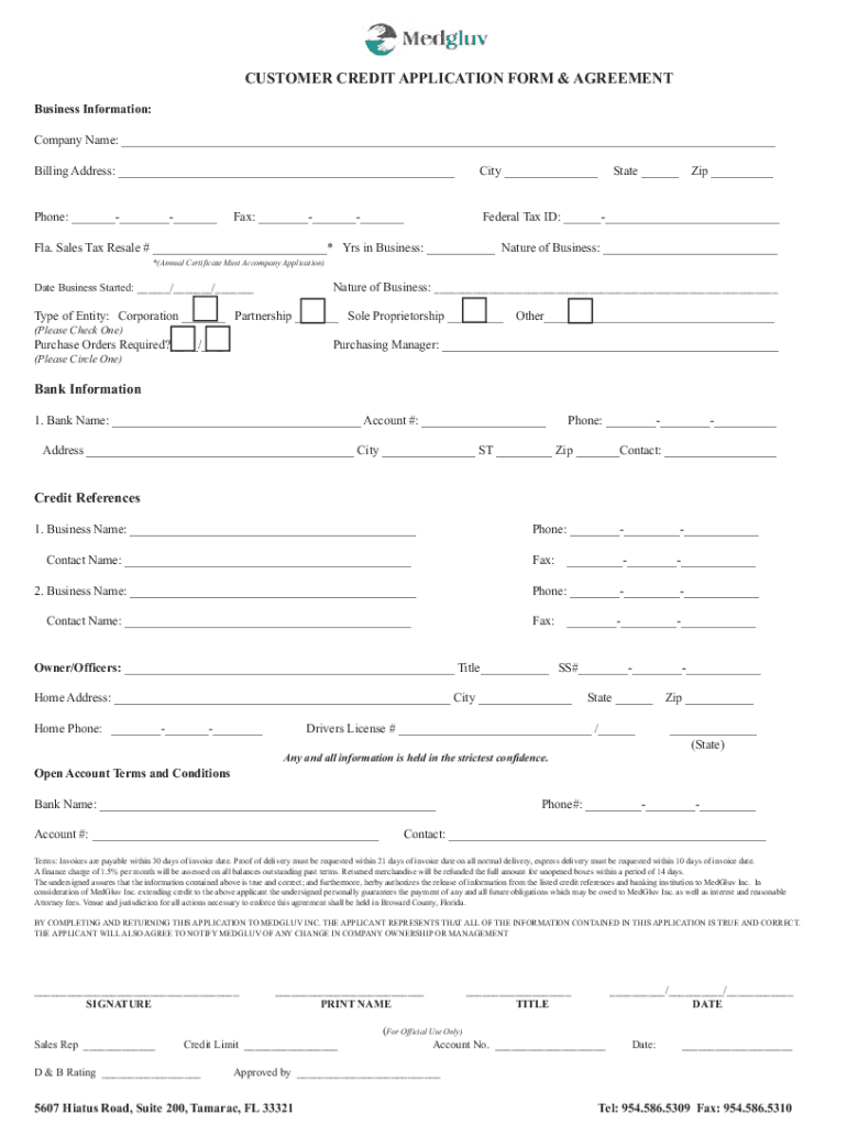 CUSTOMER CREDIT APPLICATION FORM & AGREEMENT Business Information: Company Name: ___ Billing Address: ___City ___Phone: _________Federal Tax ID: ______Fax: _________State ___Zip ___Fla. Sales Tax