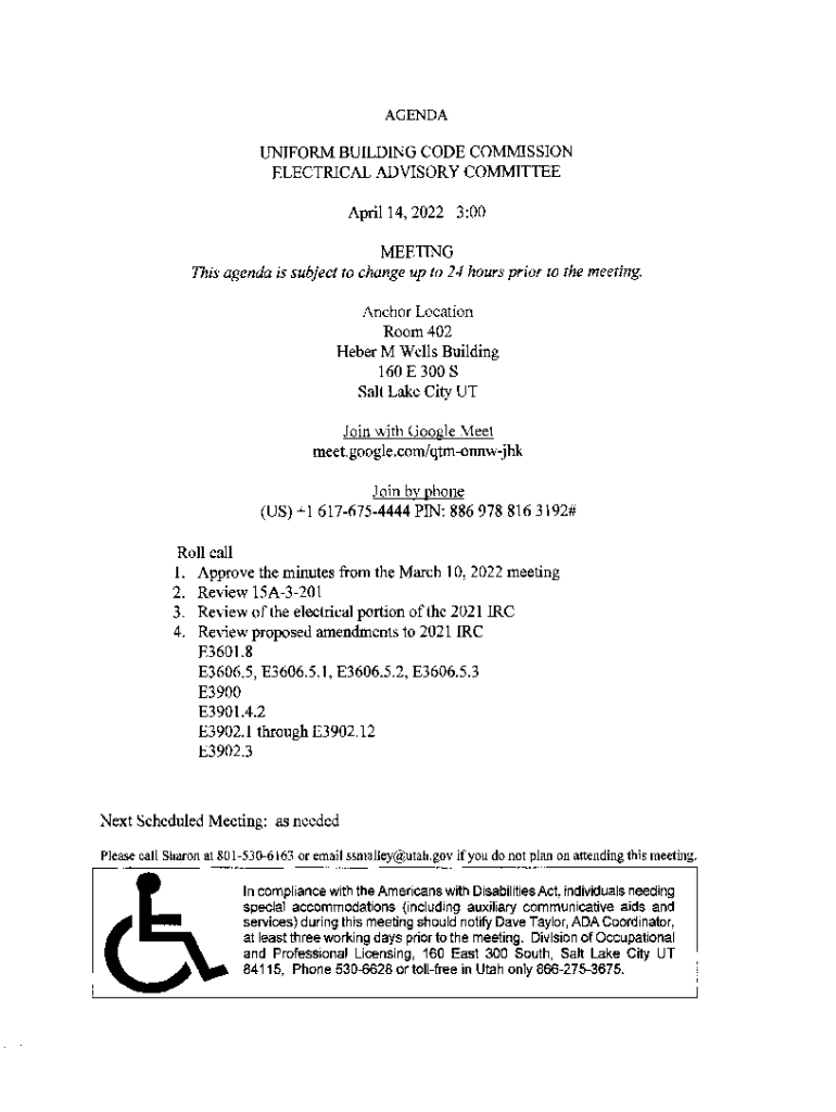 AGENDAUNIFORM BUILDING CODE COMMISSION ELECTRICAL ADVISORY COMMITTEE April 14, 2022 3 :00 MEETING This agenda is subject to change up to 24 hours prior to the meeting. Anchor Location Room402 Weber