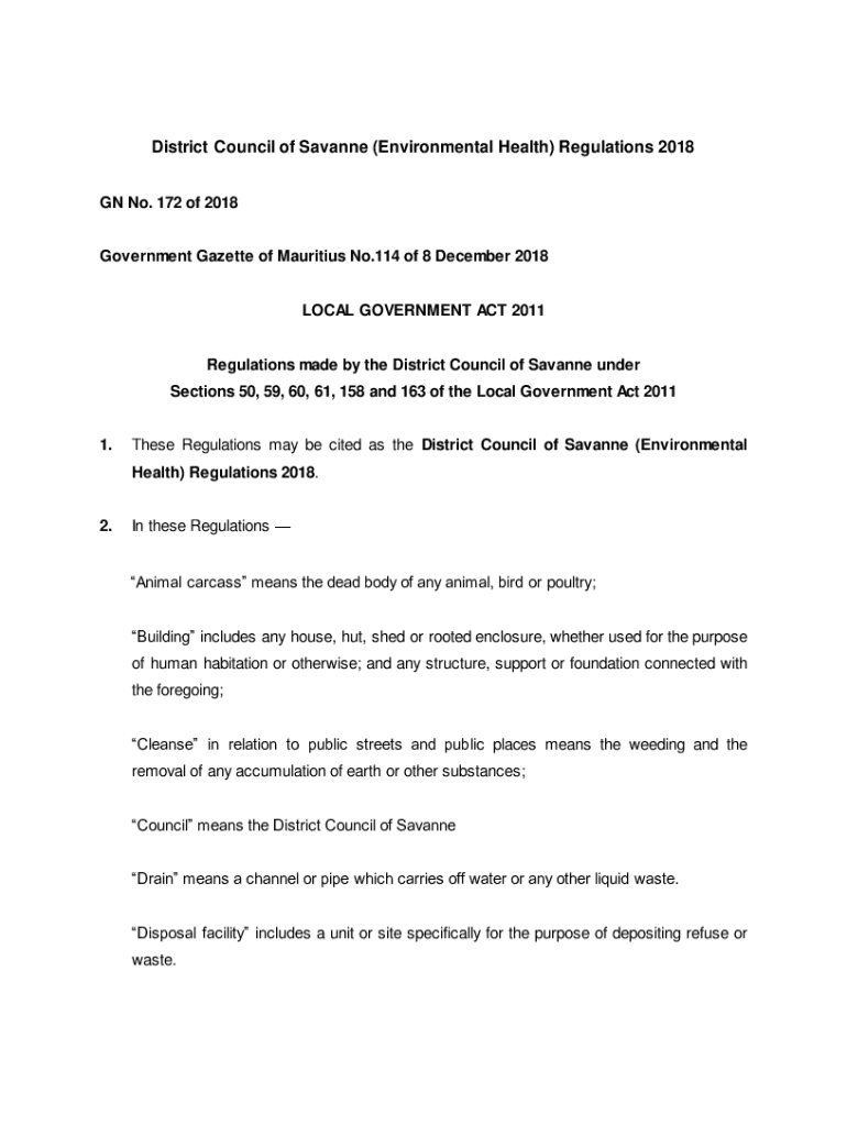 District Council of Savanna (Environmental Health) Regulations 2018 GN No. 172 of 2018 Government Gazette of Mauritius No.114 of 8 December 2018 LOCAL GOVERNMENT ACT 2011 Regulations made by the District