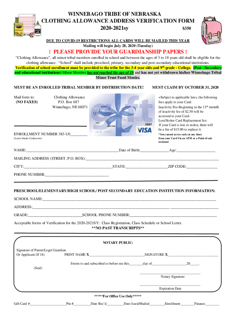 WINNEBAGO TRIBE OF NEBRASKA CLOTHING ALLOWANCE ADDRESS VERIFICATION FORM 20202021sy $350 DUE TO COVID-19 RESTRICTIONS ALL CARDS WILL BE MAILED THIS YEAR Mailing will begin July 28, 2020 (Tuesday)!