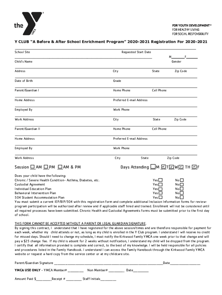 Y CLUB A Before & After School Enrichment Program 20202021 Registration Form Brentwood School District Our Philosophy To provide quality care for children, regardless of social/economic background.