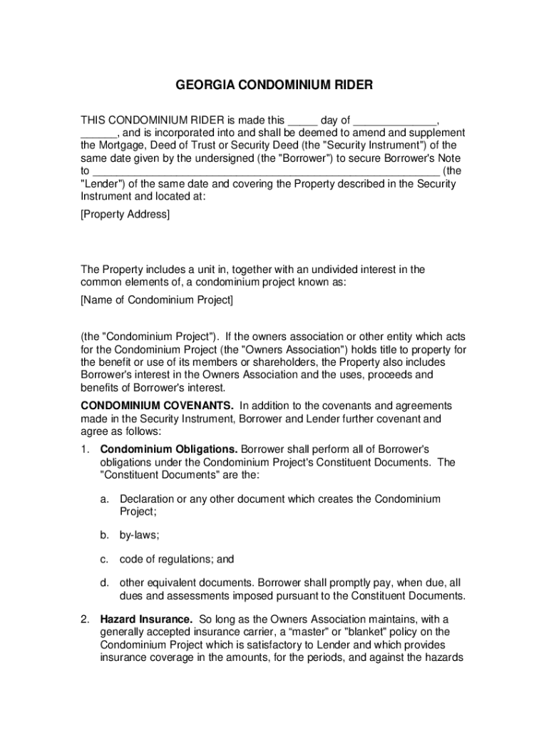 GEORGIA CONDOMINIUM RIDER THIS CONDOMINIUM RIDER is made this ___ day of ___, ___, and is incorporated into and shall be deemed to amend and supplement the Mortgage, Deed of Trust or Security Deed