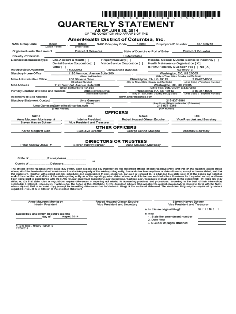 *15088201420100102* QUARTERLY STATEMENT AS OF JUNE 30, 2014OF THE CONDITION AND AFFAIRS OF THEAmeriHealth District of Columbia, Inc. NAIL Group Code0093600936,(Current Period)Organized under the Laws