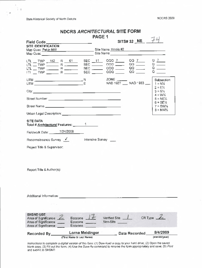 !IND CRS 2009State Historical Society of North DakotaARCHITECTURAL SITE FORM ND CRS ARCHITECTURAL PAGE 1 _ _ _ _ _ _ _ _ __ Field Code Code___NE SITS# 32 _NE14SITE IDENTIFICATION Map Quad Peking NW___